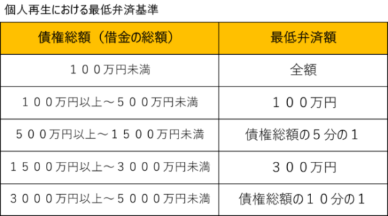 債務の額に応じた最低の弁済額を定めたものです。民事再生法第231条2項3号及び4号に規定されていますが、表にまとめると以下のようになります。