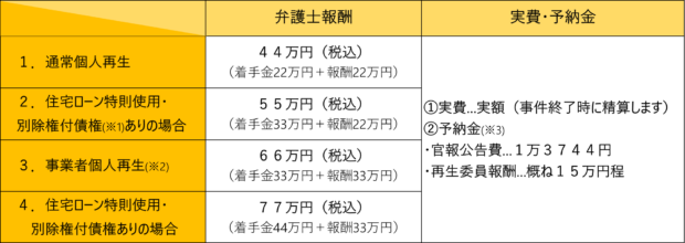 個人再生手続に関わる当事務所規定の弁護士報酬及び、予納金等については以下の通りです。